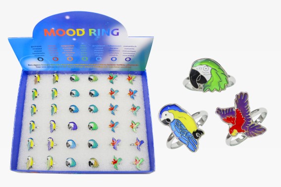 Pierścionek zmieniający kolory metalowy z kolorową arą trzy wzory minimalny zakup 36 szt.